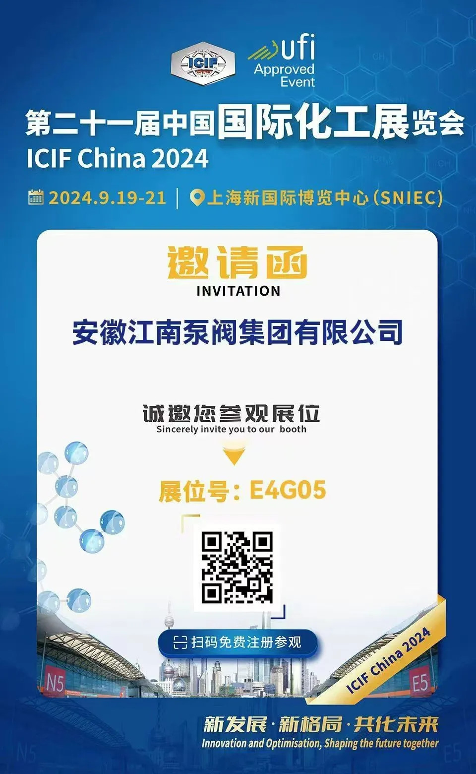 安徽江南泵閥集團有限公司于2024年9月19日-21日在上海新國際博覽中心參加第二十一屆中國國際化工展覽會,展位號為E4G05。我們誠摯邀請您蒞臨展位參觀指導!