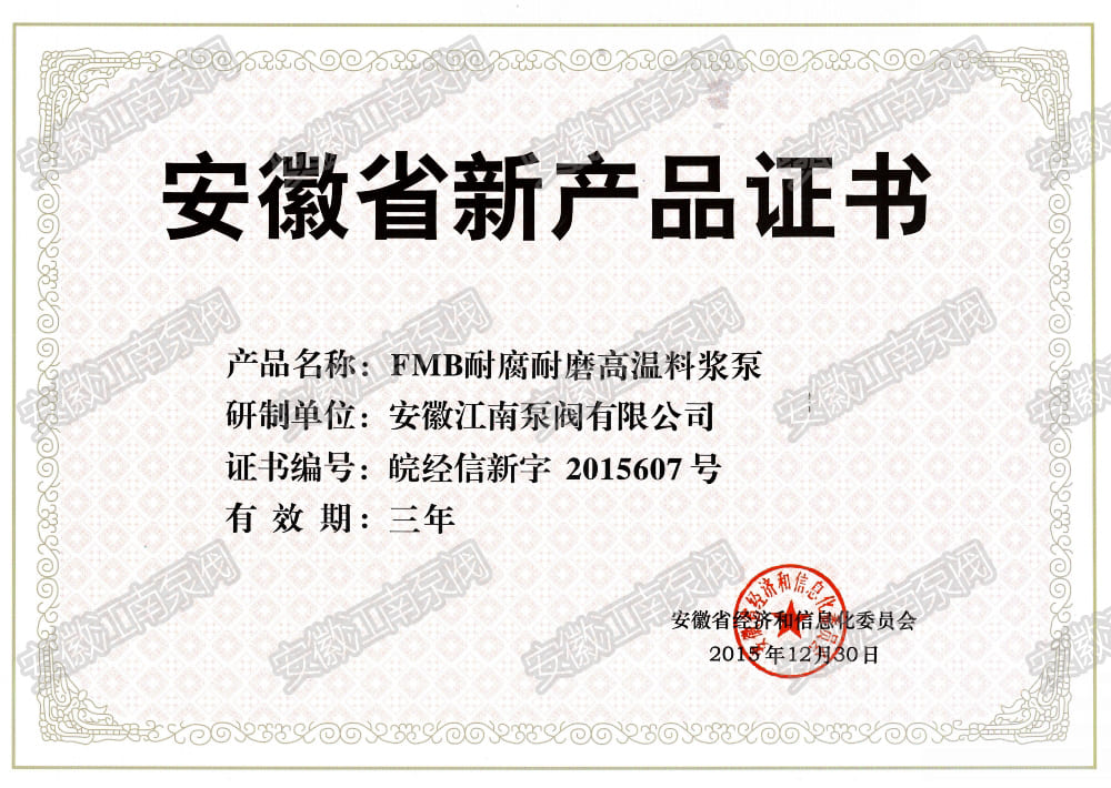 安徽江南泵閥有限公司榮獲安徽省FMB砂漿泵新產品證書,主營:氟塑料泵,不銹鋼泵,耐腐蝕化工泵,品質卓越,行業(yè)領跑企業(yè),科研生產型企業(yè)20年鑄就行業(yè)輝煌!...