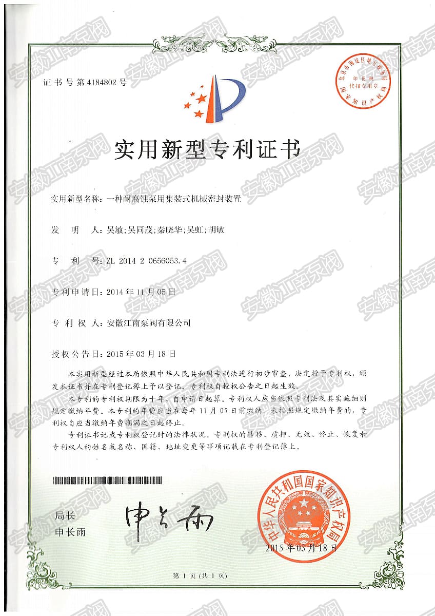 安徽江南泵閥有限公司榮獲新型耐腐蝕泵集裝式機械密封專利,主營:氟塑料泵,不銹鋼泵,耐腐蝕化工泵,品質卓越,行業(yè)領跑企業(yè),科研生產型企業(yè)20年鑄就行業(yè)輝煌!...